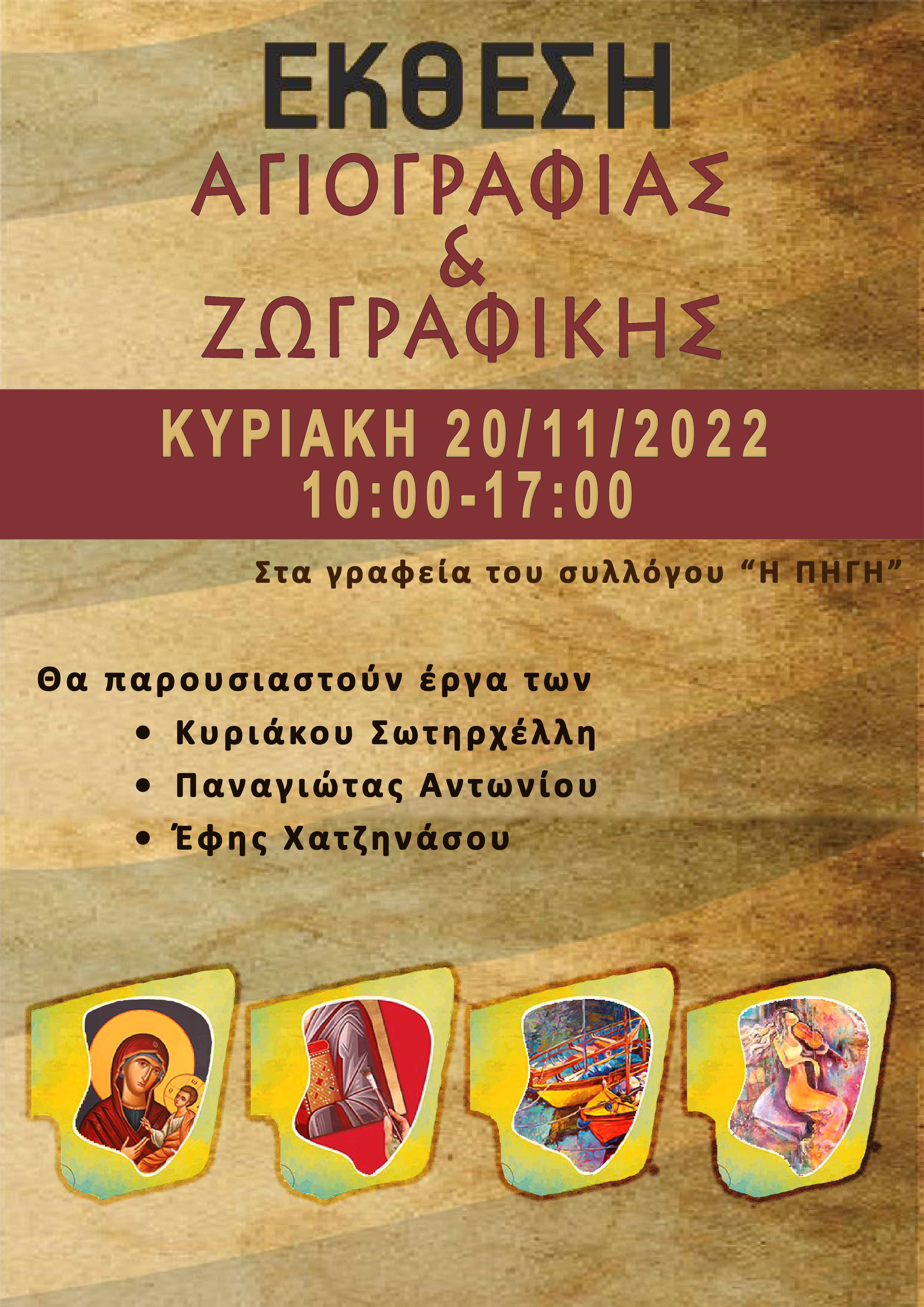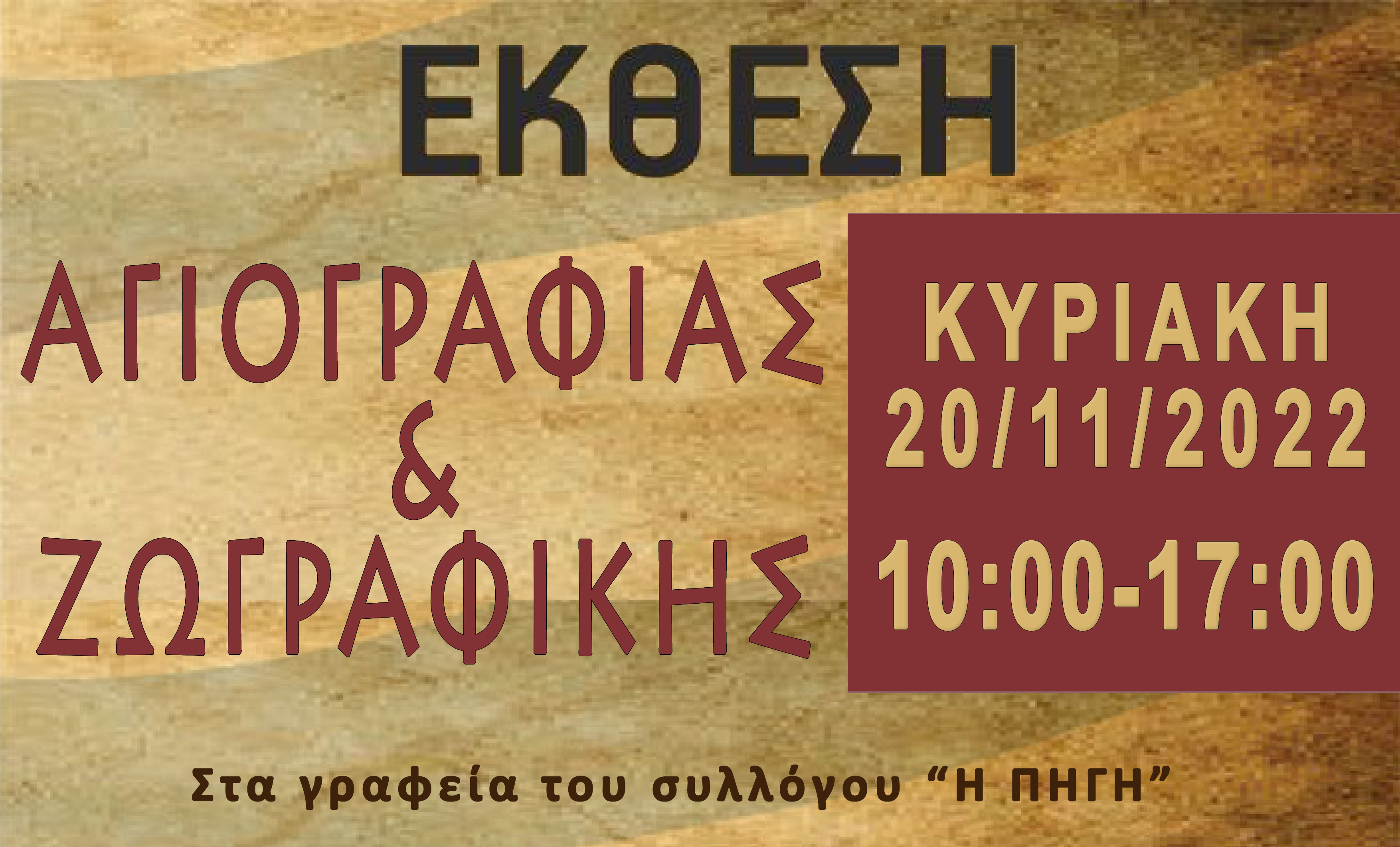 Την Κυριακή 20 Νοεμβρίου θα πραγματοποιηθεί στα γραφεία του συλλόγου “Η Πηγή” Έκθεση Ζωγραφικής και Αγιογραφίας από τις 10:00-17:00.