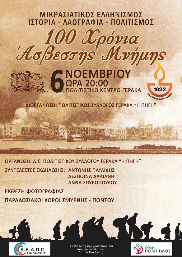 Ο Πολιτιστικός Σύλλογος Γέρακα “Η ΠΗΓΗ” συμμετέχει στις εκδηλώσεις της Κ.Ε.Α.Π.Π του Δήμου Παλλήνης “ΠΟΛΗ ΠΟΛΙΤΙΣΜΟΥ”. Η φετινή χρονιά είναι αφιερωμένη στα 100 χρόνια από την Μικρασιατική Καταστροφή. Κάθε τεύχος του περιοδικού έχει 2 άρθρα, ένα ιστορικό των γεγονότων και ένα πολιτιστικό για την Μικρασία που χάθηκε. Η κορύφωση της τιμής για τα 100 χρόνια είναι η εκδήλωση που θα πραγματοποιηθεί στις 6 Νοεμβρίου στο Πολιτιστικό Κέντρο Γέρακα με τίτλο “ΜΙΚΡΑΣΙΑΤΙΚΟΣ ΕΛΛΗΝΙΣΜΟΣ ΙΣΤΟΡΙΑ – ΛΑΟΓΡΑΦΙΑ -ΠΟΛΙΤΙΣΜΟΣ”.