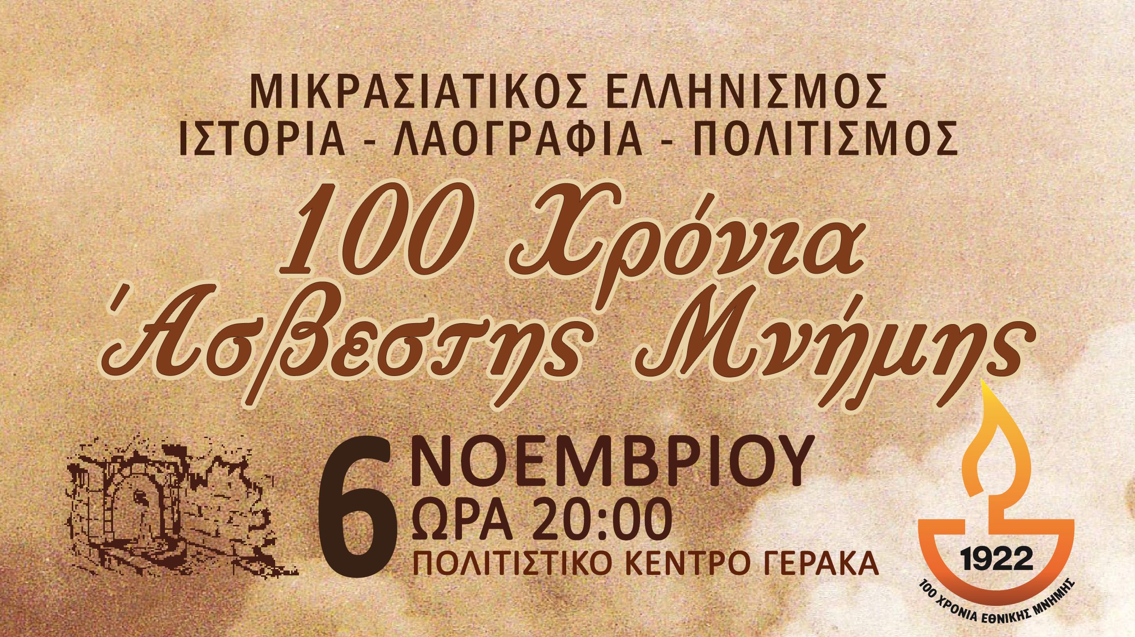 Η κορυφαία εκδήλωση της «ΠΗΓΗΣ» για τη φετινή χρονιά με τίτλο «100 ΧΡΟΝΙΑ ΑΣΒΕΣΤΗΣ ΜΝΗΜΗΣ – Μικρασιατικός Ελληνισμός Ιστορία – Λαογραφία – Πολιτισμός» πραγματοποιήθηκε με τεράστια επιτυχία, την Κυριακή 6 Νοεμβρίου στο Πολιτιστικό Κέντρο Γέρακα. Η βραδιά ήταν αφιερωμένη στα 100 χρόνια από τη Μικρασιατική Καταστροφή. Μια σημαντική επέτειο που δεν μπορούσε να αφήσει αδιάφορο τον παλαιότερο πολιτιστικό σύλλογο του τόπου μας.
