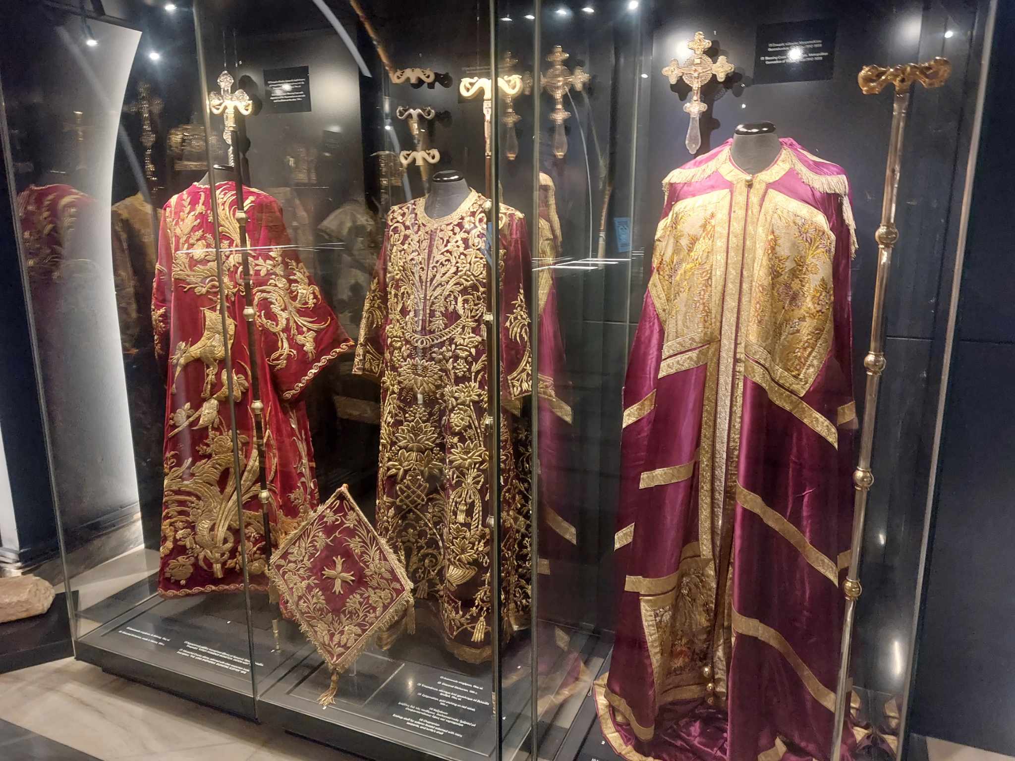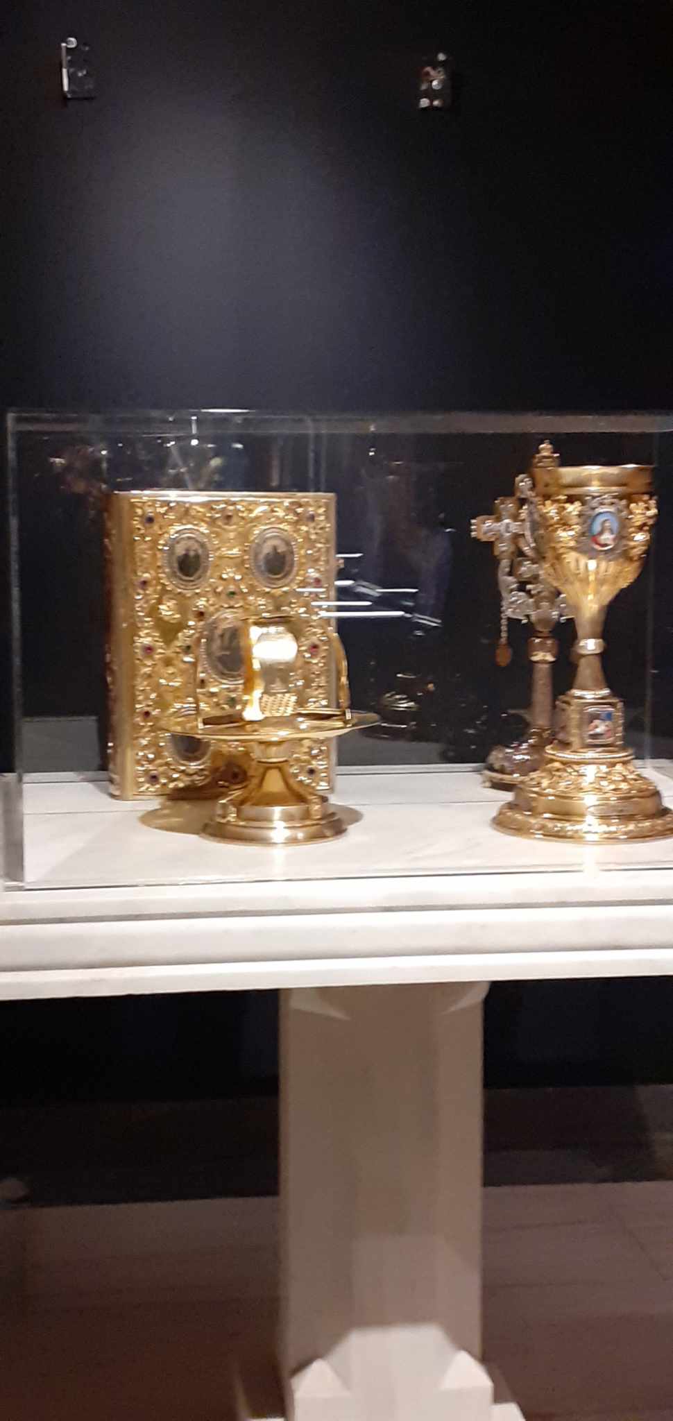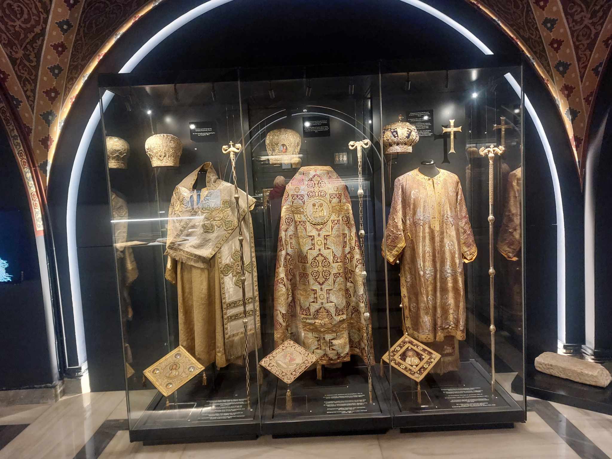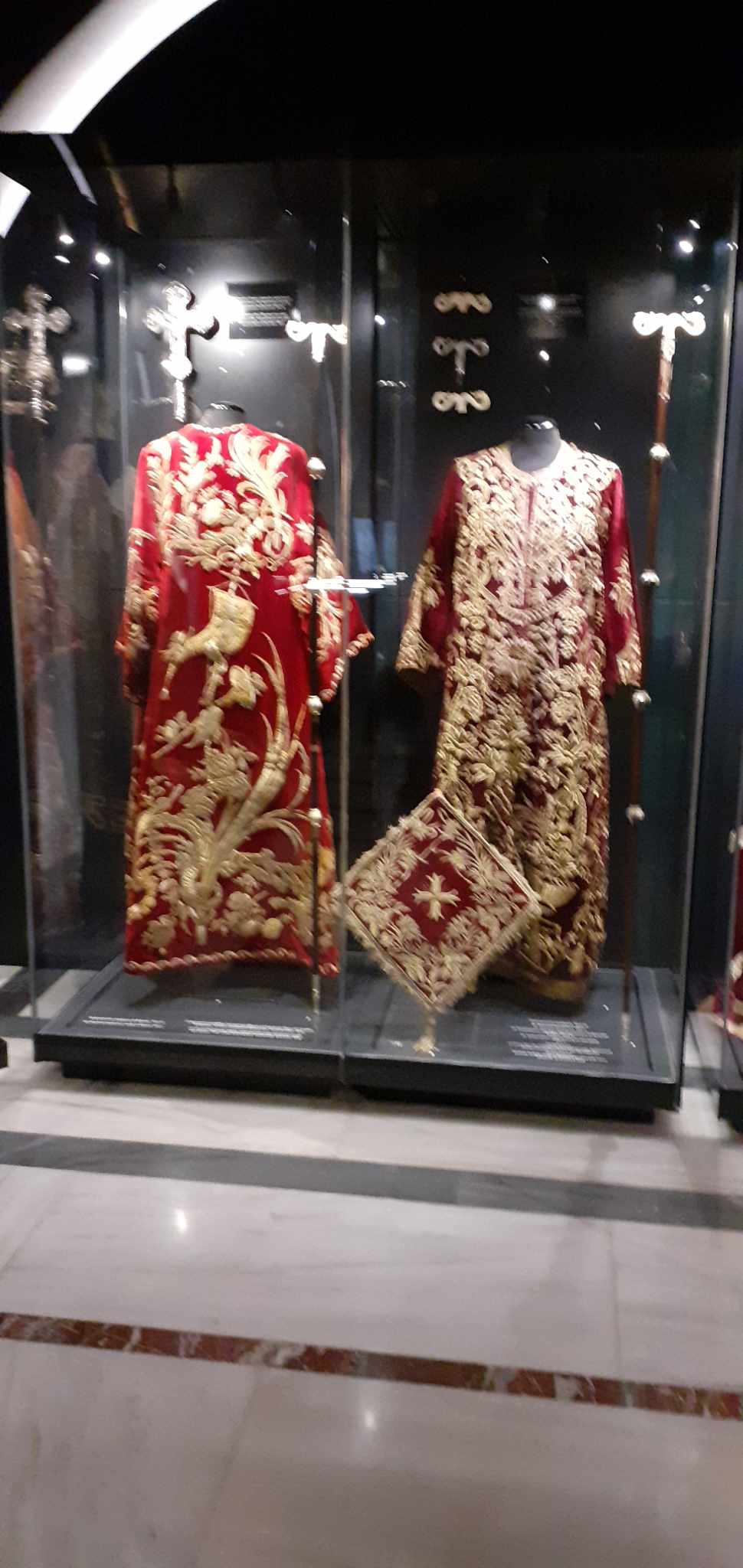 Στο μουσείο είδαμε μουσικά χειρόγραφα που γράφτηκαν πριν από εκατοντάδες χρόνια, ολόχρυσα ιερά δισκοπότηρα, βασιλικά δώρα προς τον ναό, Ευαγγέλια γραμμένα στα καραμανλίδικα, ακόμη και θρόνους στους οποίους εκκλησιάζονταν οι βασιλείς, τα περισσότερα εκ των οποίων ήταν δωρεές. Πολλά προέρχονταν από πρόσφυγες της Μικράς Ασίας, από τον Πόντο και την Κωνσταντινούπολη, όπως τα αριστουργήματα της φημισμένης κεντήστρας της Πόλης Δεσποινέτας, που χρονολογούνται από τον 17ο αιώνα και αποτελούν αντικείμενα μεγάλης ιστορικής αξίας, ή τα χρυσά κεντήματα της Πολίτισσας Κοκώνας του 19ου αιώνα. Άλλα έφτασαν εκεί από Έλληνες της Ρωσίας, της Δυτικής Ευρώπης, ακόμα και της Καλκούτας.