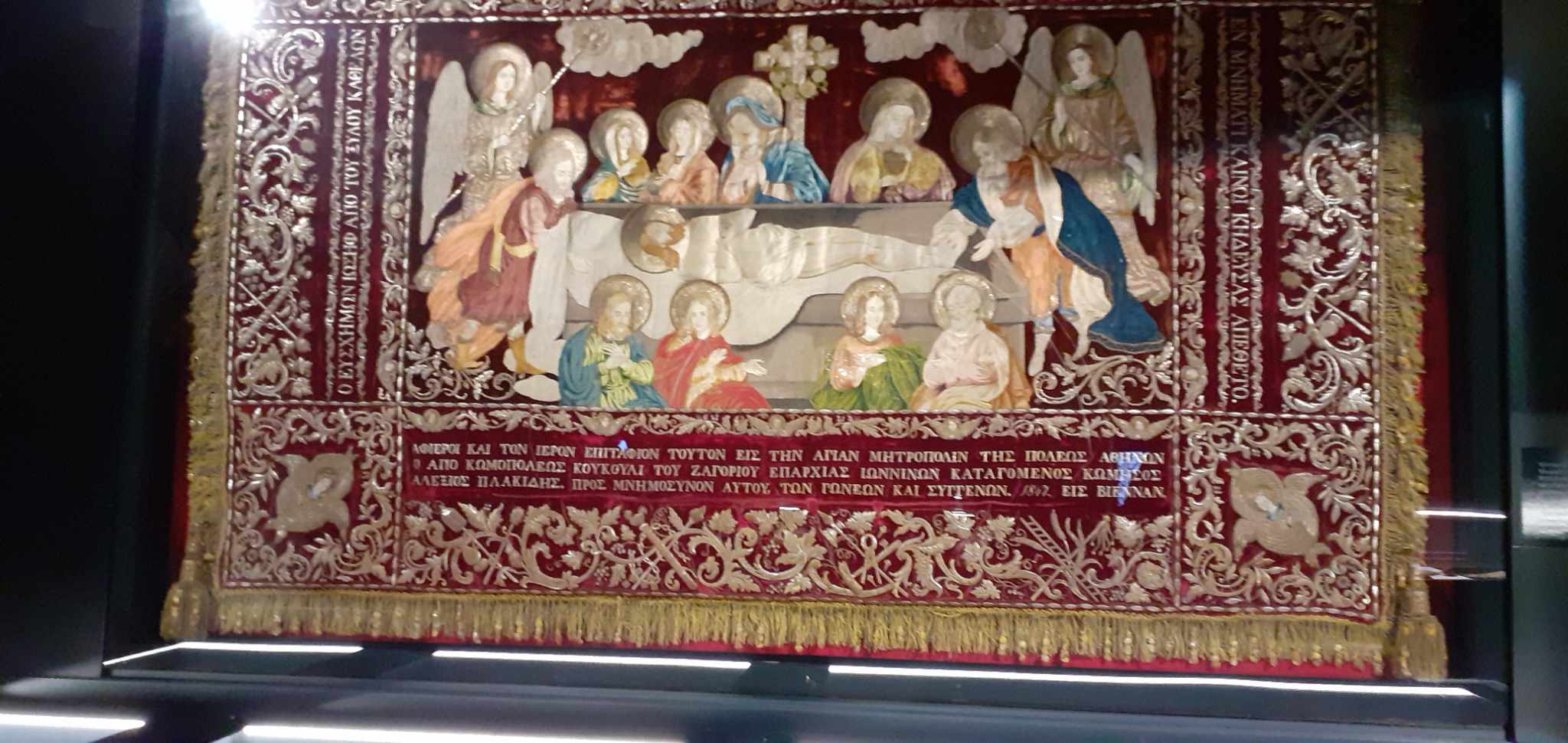 Ξεχωριστή θέση ανάμεσά στα εκθέματα καταλαμβάνει ένας εξαιρετικός Επιτάφιος από χρυσόνημα και μεταξωτές κλωστές, που κεντήθηκε στη Βιέννη το 1847 και δωρήθηκε στη Μητρόπολη Αθηνών από τον Αλέξιο Πλακίδη και ήταν ο πρώτος Επιτάφιος του Καθεδρικού Ναού. Στο Κειμηλιοφυλάκιο βρίσκεται επίσης μια εικόνα της Αγίας Σκέπης που φιλοτέχνησε ο Φώτης Κόντογλου το 1941.