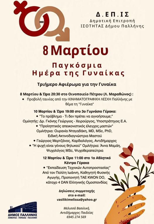 Με μια σειρά από εκδηλώσεις και δράσεις αφιερωμένες στις Γυναίκες γιορτάζει ο Δήμος Παλλήνης την Παγκόσμια Ημέρα της Γυναίκας (8 Μαρτίου).