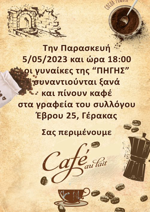 Την Παρασκευή 5 Μαΐου 2023 και ώρα 18:00 θα πραγματοποιηθεί η καθιερωμένη συνάντηση των γυναικών της ΠΗΓΗΣ για καφέ και κουβέντα στα γραφεία του συλλόγου.