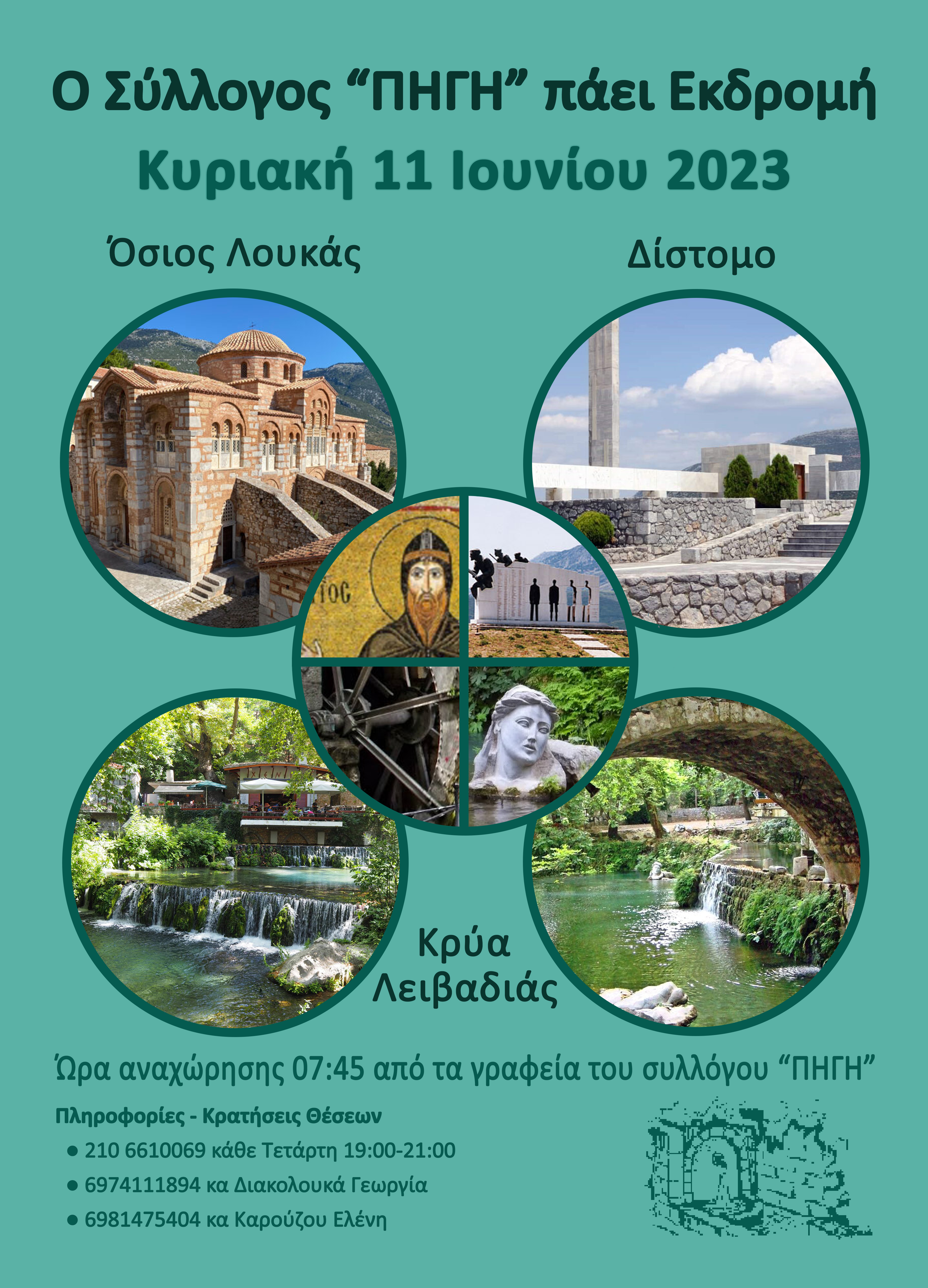 Ο Πολιτιστικός Σύλλογος “Η ΠΗΓΗ” του Γέρακα πάει εκδρομή την Κυριακή 11 Ιουνίου 2023 στον Όσιο Λουκά, το Δίστομο και την Κρύα Λειβαδιάς.