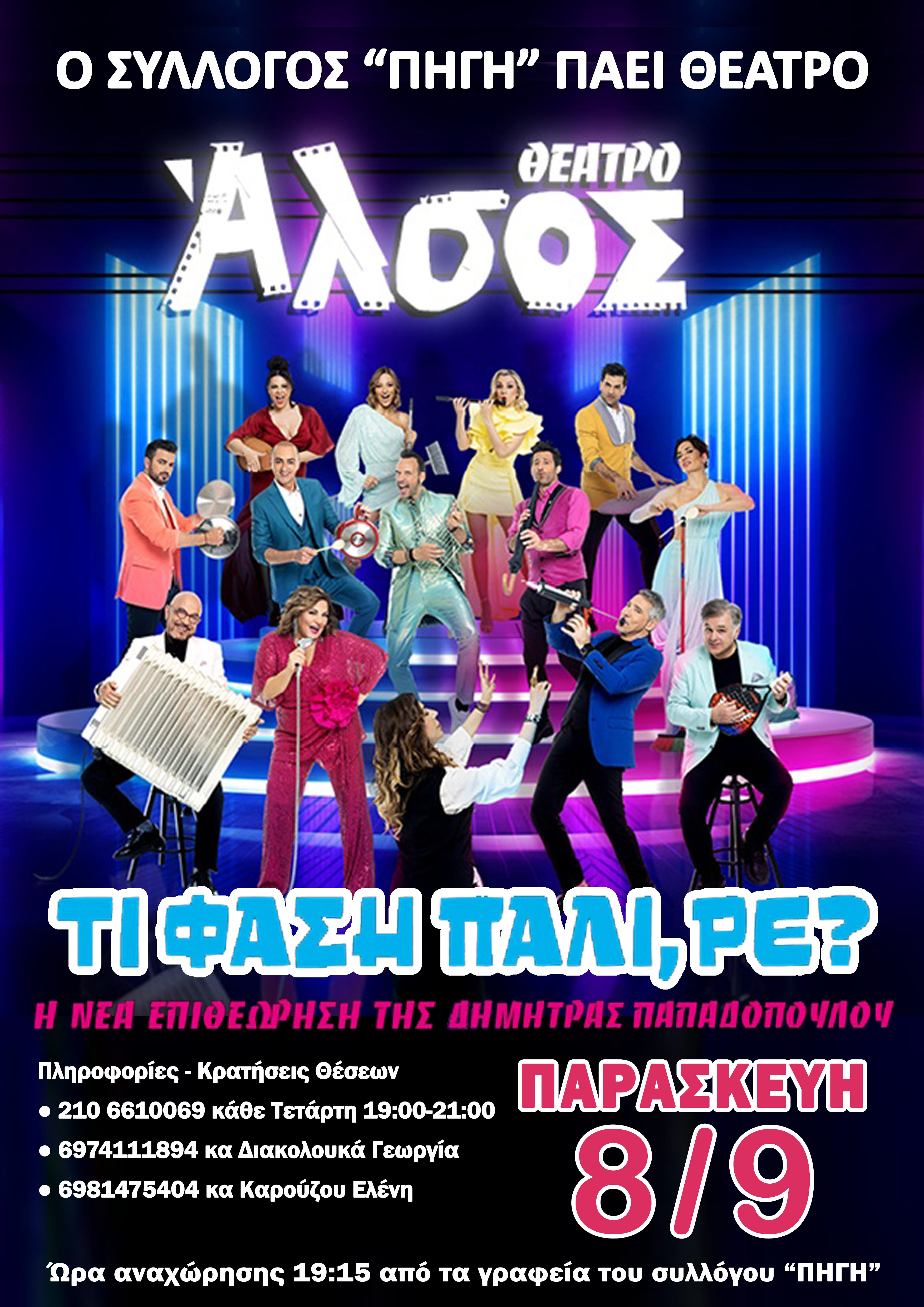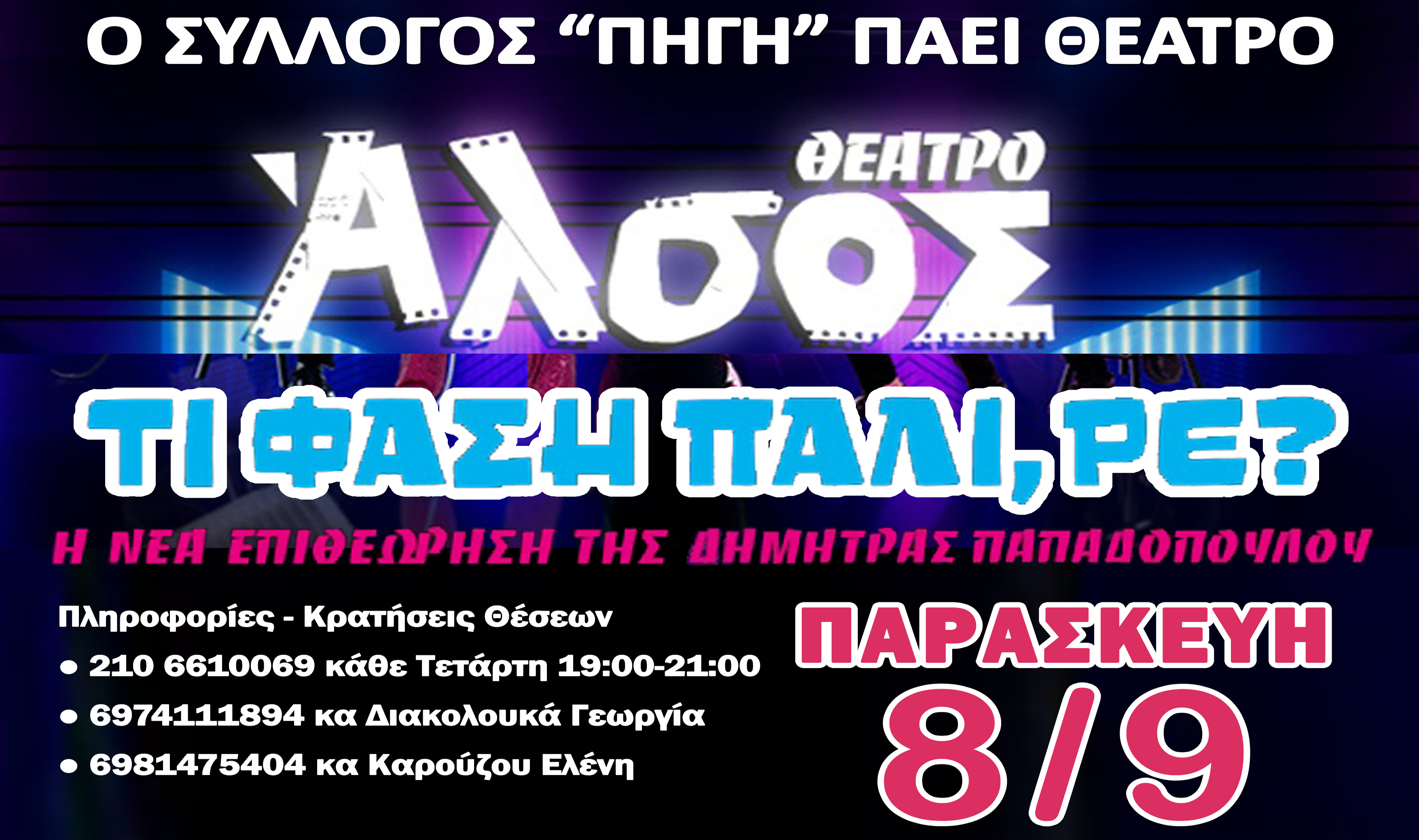 Ο Σύλλογος “Η ΠΗΓΗ” πάει Θέατρο, την Παρασκευή 8 Σεπτεμβρίου 2023 στο Θέατρο Άλσος, για να παρακολουθήσουμετην επιθεώρηση της Δήμητρας Παπαδοπούλου “Τι Φάση Πάλι Ρε?”.