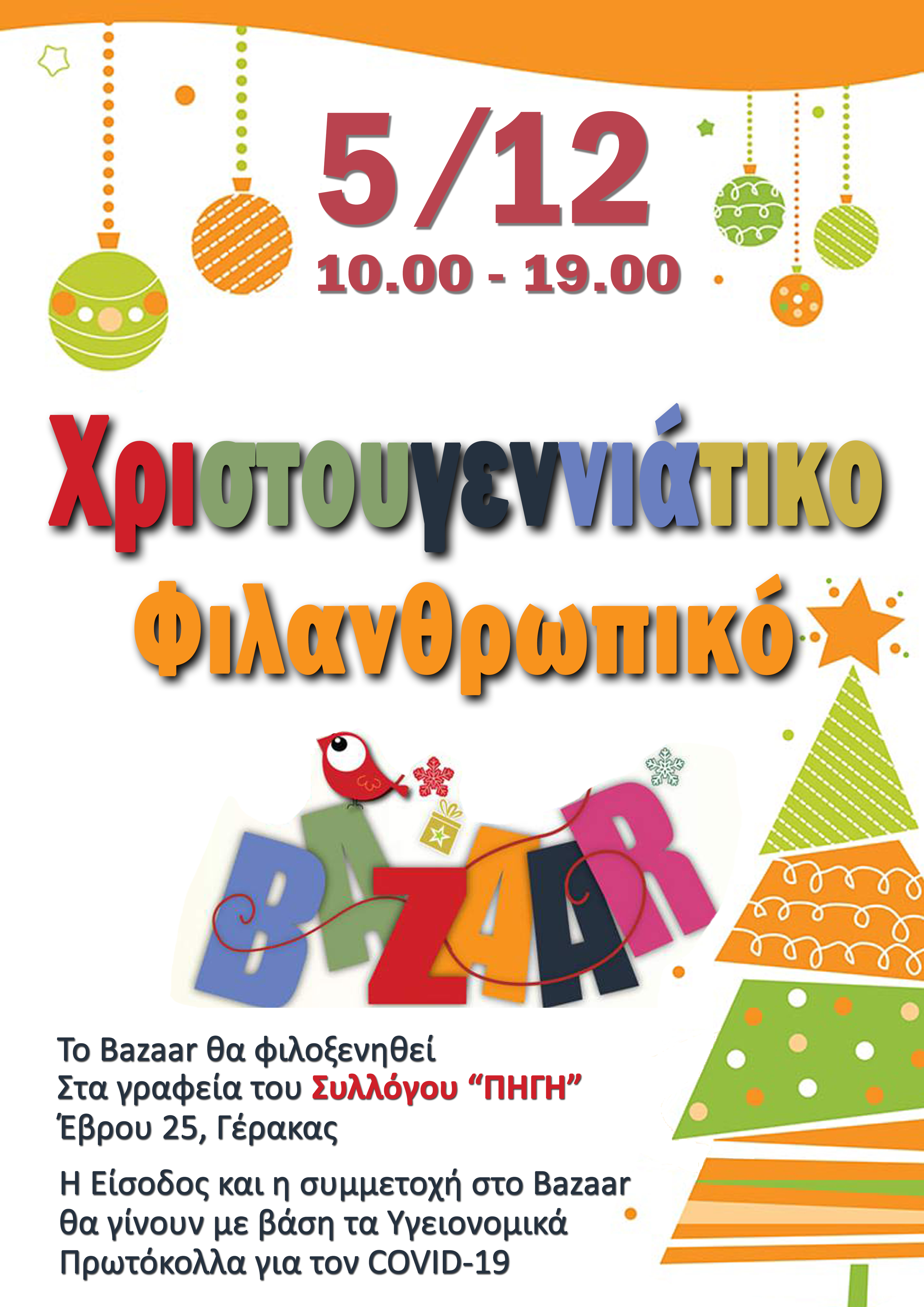 Ο Σύλλογος “Η ΠΗΓΗ” διοργανώνει το Σάββατο 5 Δεκεμβρίου 2021 στα γραφεία του, Έβρου 25, Χριστουγεννιάτικο Φιλανθρωπικό Bazaar.