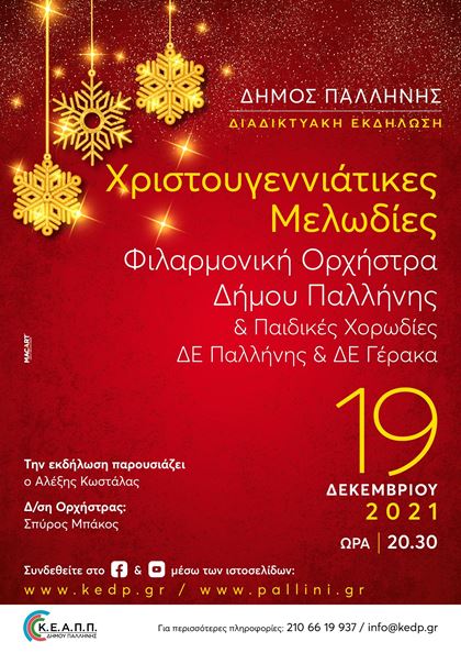 H Κοινωφελής Επιχείρηση του Δήμου Παλλήνης διοργανώνει την Κυριακή 19-12-2021 και ώρα 20.30, διαδικτυακή εκδήλωση με Χριστουγεννιάτικες Μελωδίες από την Φιλαρμονική Ορχήστρα του Δήμου Παλλήνης και Παιδικές Χορωδίες.