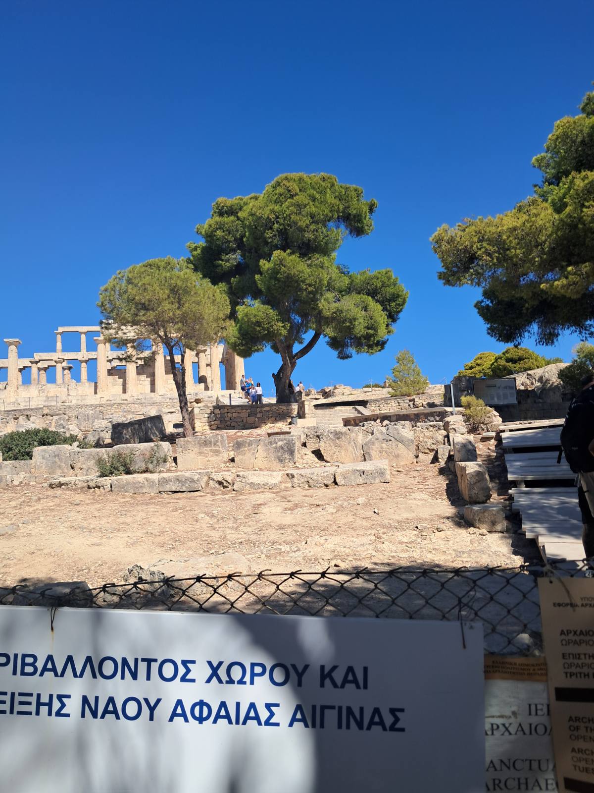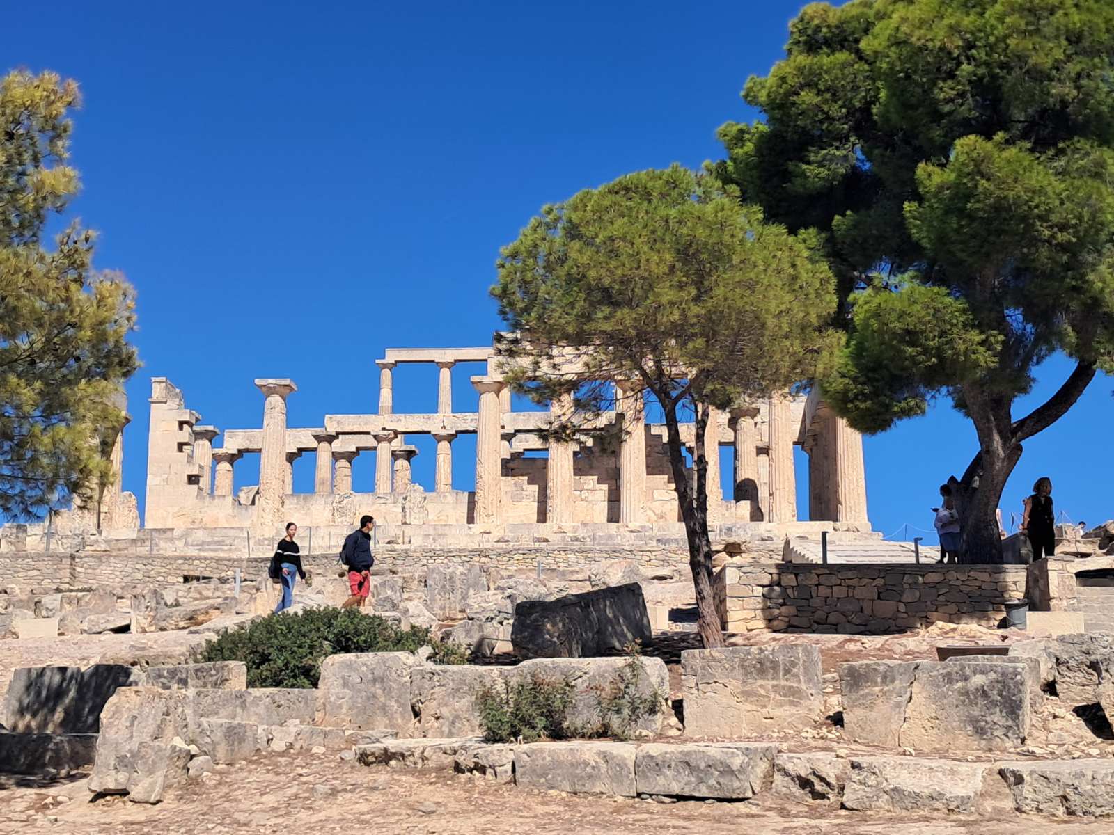 Μετά την επίσκεψή μας στο μοναστήρι, αποχωρήσαμε με προορισμό το Ναό της Αφαίας Αθηνάς. Ο ναός είναι δωρικού ρυθμού και βρίσκεται στην ανατολική πλευρά του νησιού σε υψόμετρο 160 μέτρων. Θεωρείται ότι κατασκευάστηκε στο 500-490 π.Χ σε δεύτερη φάση και αποτέλεσε πρότυπο για την κατασκευή του Παρθενώνα, από τους αρχιτέκτονες Ικτίνο και Καλλικράτη.